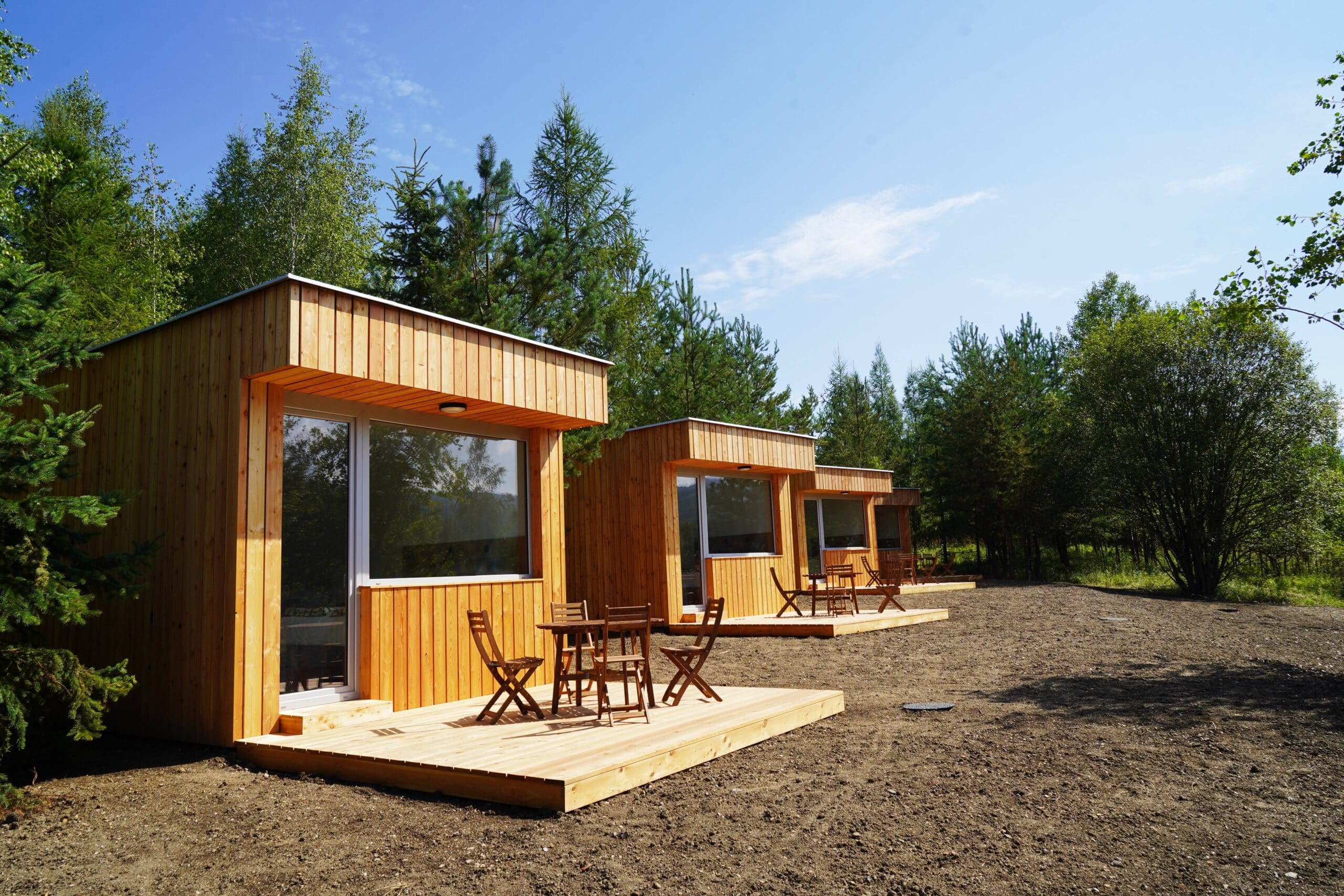 Pro začátek budou k dispozici 4 modulární rekreační chaty o zastavěné ploše cca 26 m2 (3,5×7,5 metru). „Chaty jsou zasazeny do terénu s respektem k původní zeleni. Dispozičně se jedná o obývací místnost s kuchyňským koutem a koupelnou včetně WC. K tomu patří letní terasa, která propojuje venkovní a vnitřní prostor. Všechny chaty samozřejmě mají potřebnou infrastrukturu, tedy elektro, vodovod, kanalizaci. Návštěvníkům určitě zpříjemní pobyt i klimatizace a připojení na internet,“ popsal Martin Šulák, jednatel společnosti SUAS Solutions, která je členem skupiny SUAS GROUP.