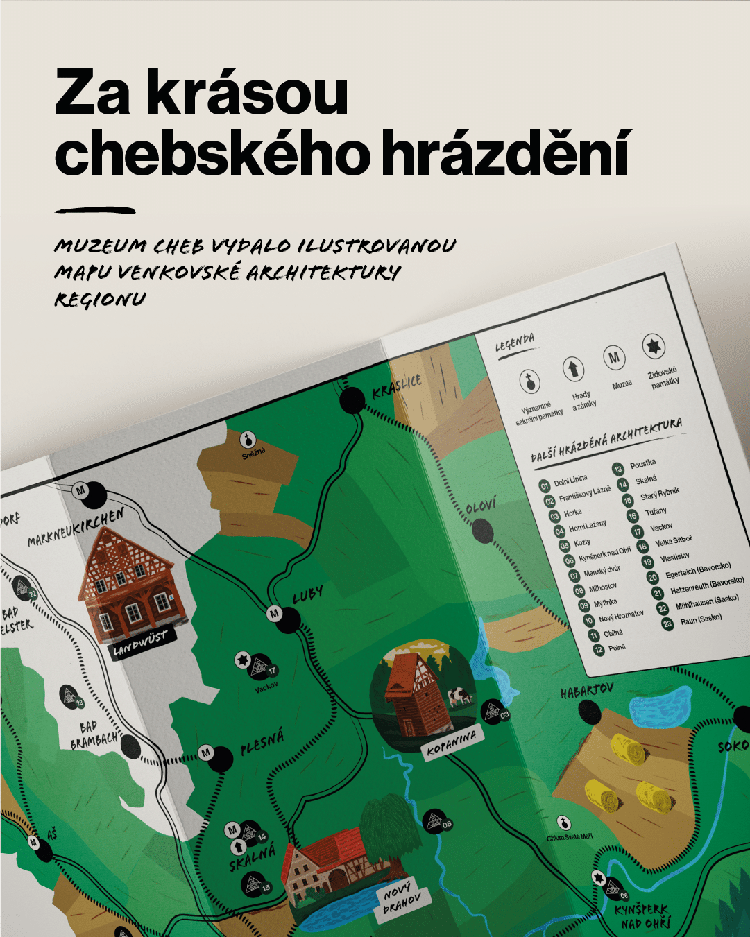 V roce 2026 Muzeum Cheb představuje novou vizuálně atraktivní mapu, která přibližuje nejcennější příklady venkovské hrázděné architektury historického Chebska. Mapa, zpracovaná ve třech jazykových mutacích, poutavou výtvarnou formou upozorňuje na místa, kde může návštěvník objevovat jedinečné architektonické dědictví a kulturní krajinu česko‑bavorsko‑saského trojmezí. Nové propagační materiály byly veřejnosti poprvé představeny v souvislosti se zahájením letošní turistické sezóny muzejního statku Milíkov čp. 18 v sobotu 28. března 2026.